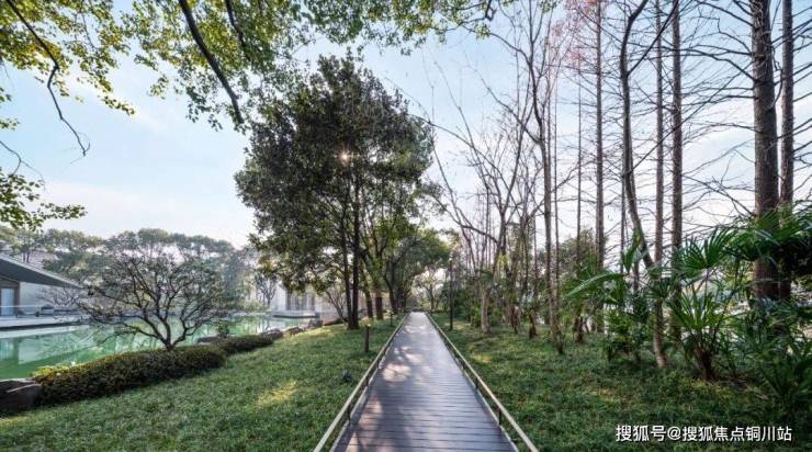 从接待厅行至超8000㎡滨河公园,两排原生树阵迎风而立。高耸挺拔的水杉会在秋天变红,林下空间还设置了休闲运动区。实际上,这是一座环湖森林,你可以在一步一行中,在香樟、水杉、广玉兰的场景里,不断切换你的游园情绪。这就是中吴江南春的高级造景心法,创造更丰富的“情绪价值”。