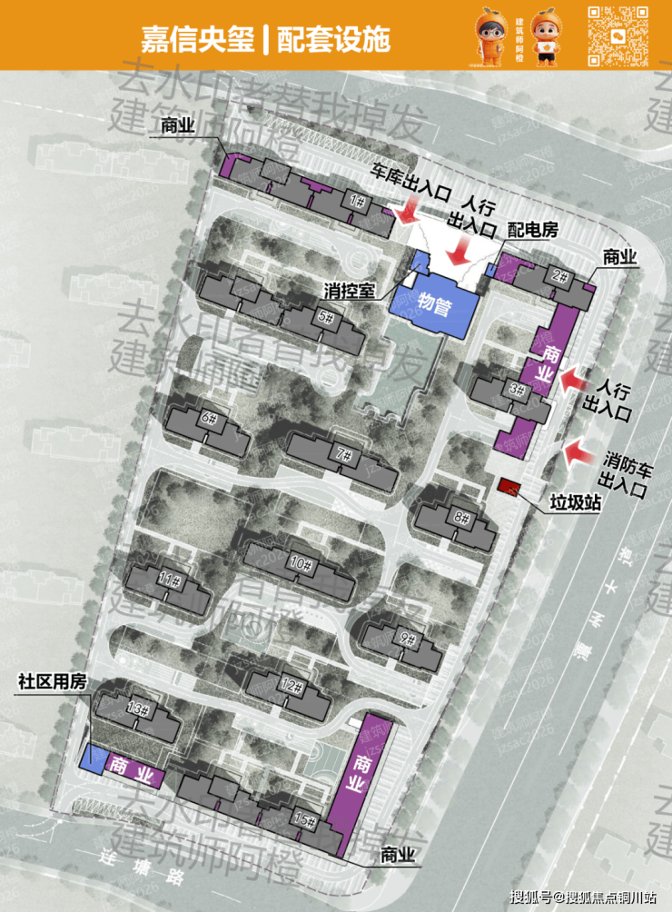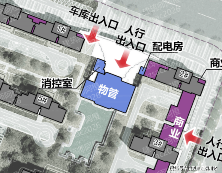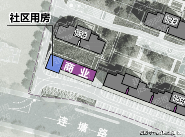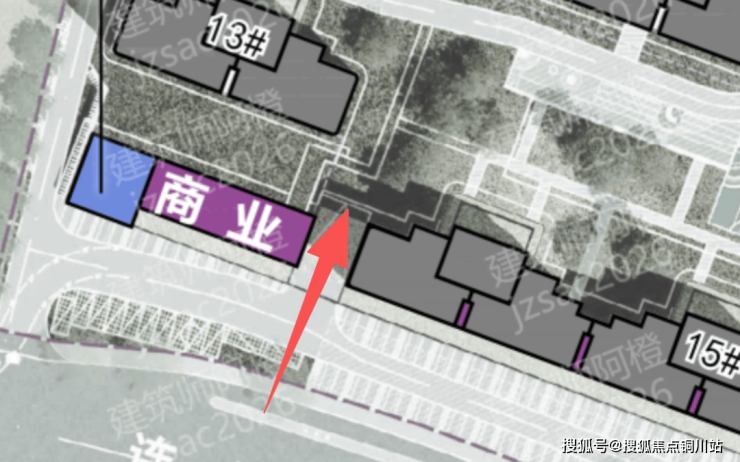 商业占比:2.41%(略高,规划上限为3%)。在影响方面,13#、15#栋受影响较大(这一块场地内外高差不大);3#影响次之(东侧临商业且有高差处理);1#2#影响最小(内外最大高差约7米,视觉影响没有,但需要关注设备、管道等影响)