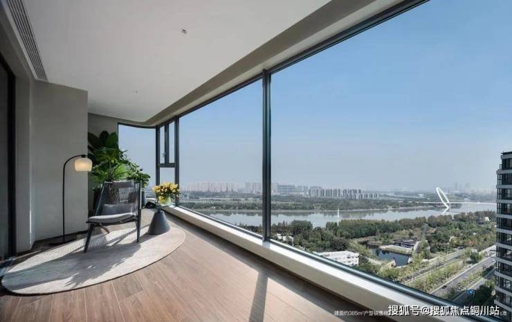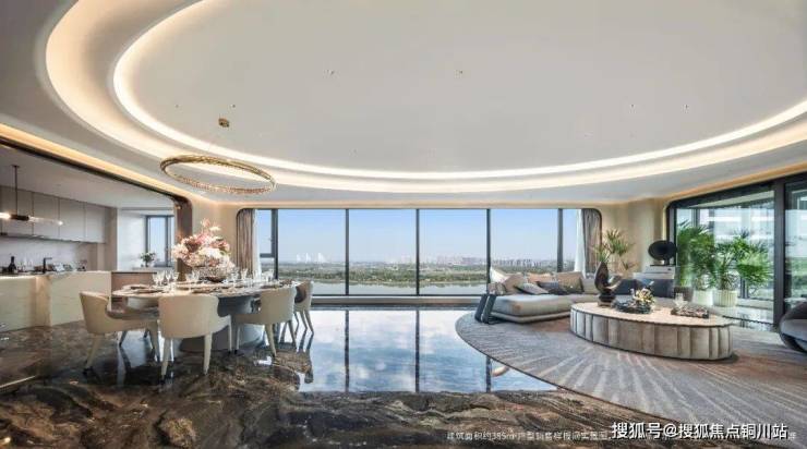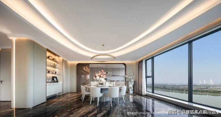 北侧的公区可称之为“空中长江会客厅”,客餐厅一体化建面超60㎡,可以容纳16人的家族派对。并且,这里有着奢侈的270°环幕瞰江视野,北向景观面约15m宽,搭配全落地超大面扇的旭格系统窗,立于超体量落地窗前,便能深刻体会拥有城市封面地标资产的感觉——江岸线如丝带般延伸,南京眼与公建地标,让“夹江最迷人的一弯美景”,在眼前铺展。