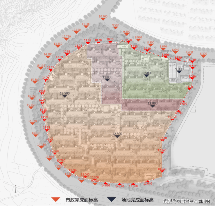 场地原生东北低、西南高,最大高差达6米。设计不做削峰填谷的对抗,而是依山就势,将坡地梳理为三阶主要台地,并于12.5与9.5标高之间,嵌入缓坡过度,利用景观巧妙衔接。如此,层叠的不仅是标高,更是如画舒展的景观序列。西侧与道路的衔接,则以绿意放坡悄然化解,使建筑从容生长于地形之中。