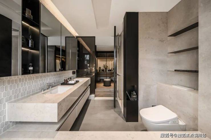 卫生间配有超大尺寸的镜柜,除了常规功能外,做大了储物空间,双台盆的设计,石材台面清洗简单打理方便。