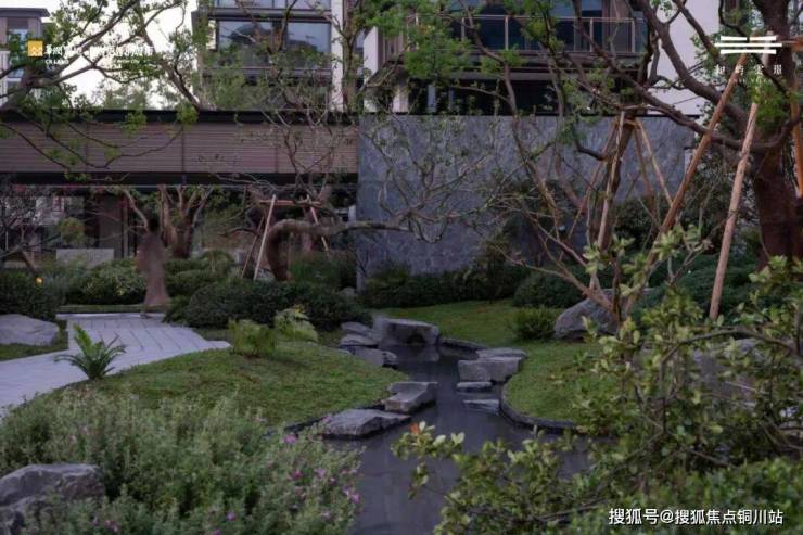 整座下沉式庭院借鉴了四明山“石隐云深”的自然基因,而顺着水轴向南,会是知屿云璟极具造诣的“红线内外一体化设计”所呈现的,约300米绵延的滨河景观带。