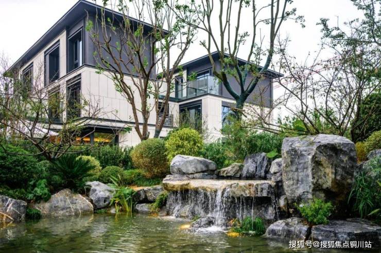 有云纹长寿石,红枫对称而布,山石、林泉、楼阁错落分布,形成曲水静心、泉林幽径、亭台揽胜三处造景的精致园林盛景……