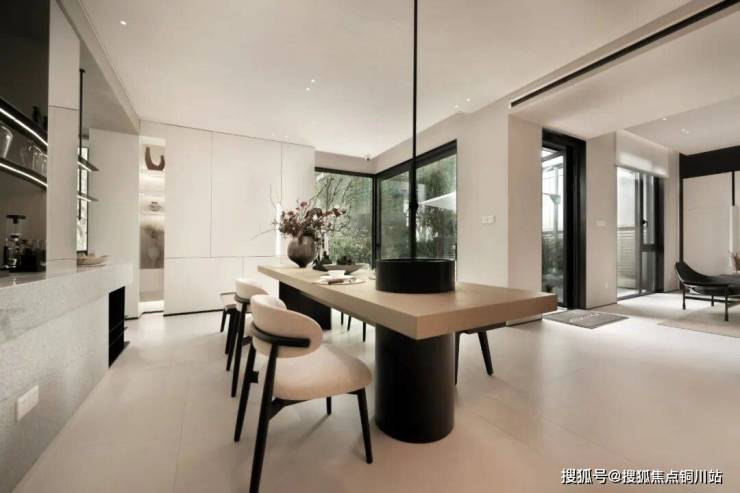 一楼,层高高达3.3米,客餐厅的南向开间达约8.15米,全部标配断桥铝材系统巨幕落地窗,并形成270°三面环景,这种住在庭院中的方式,业主的采光、通风、视野都是拉满的。