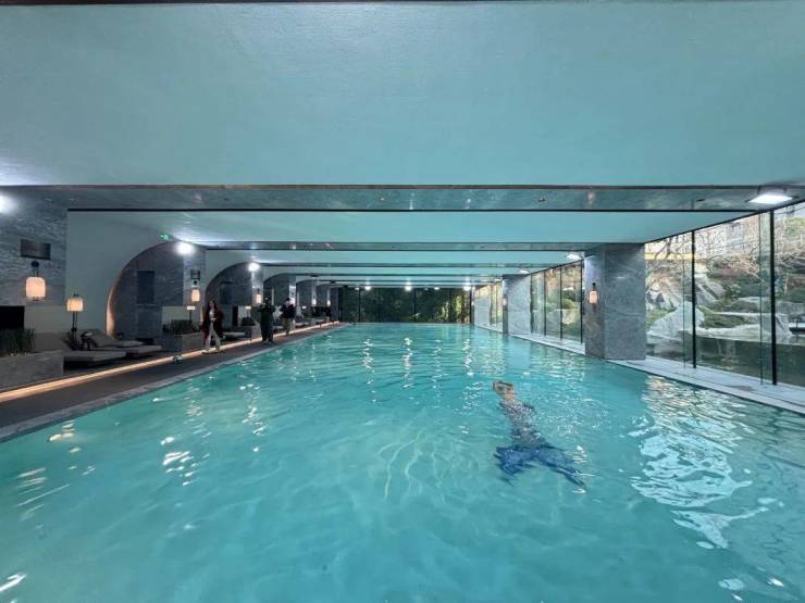 业主游泳的时候,透过全景玻璃幕墙,可以看到山水瀑布的自然风景。
