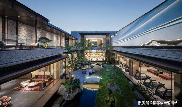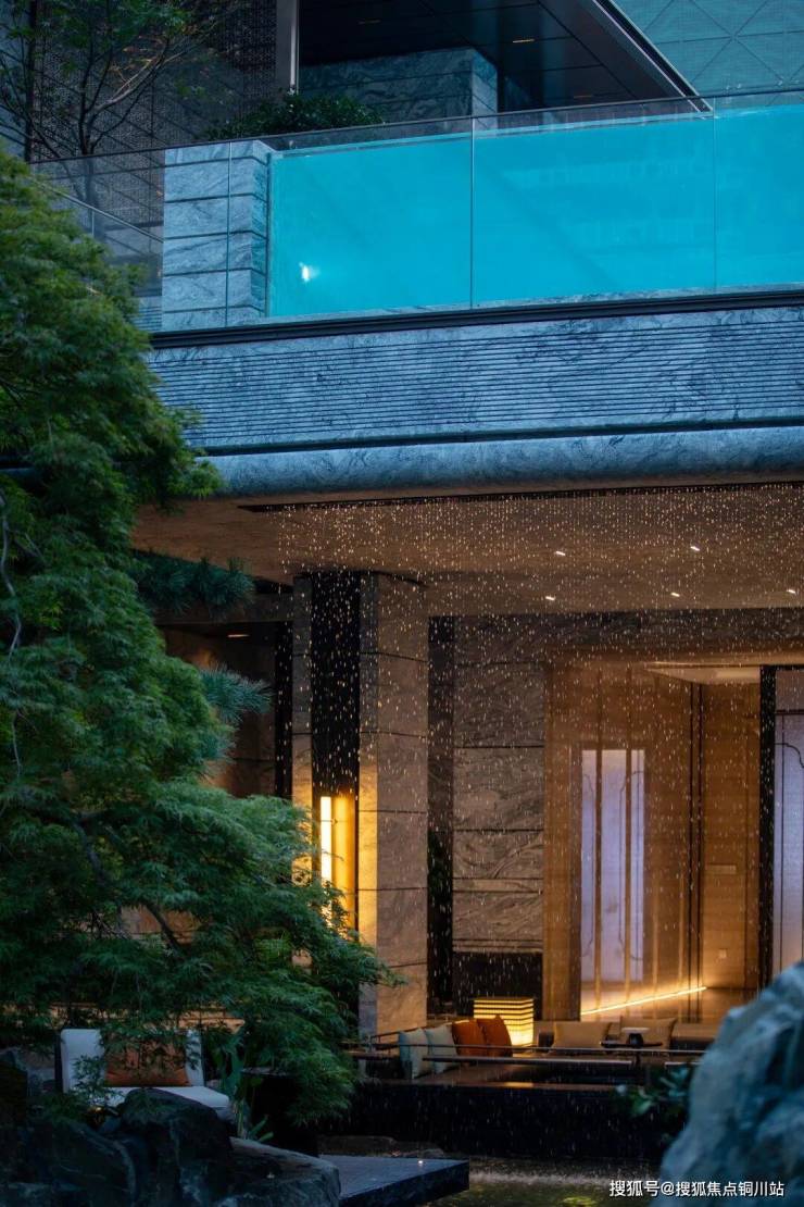 公区引水入园,打造约150米中央景观水系「松壑长风」,还有江南岸首个瀑布泳池,命名「银河九天」,还有面积约520㎡的下沉庭院。