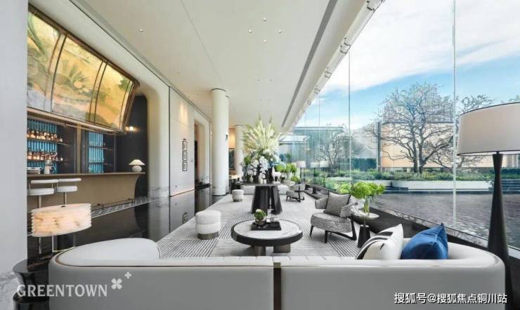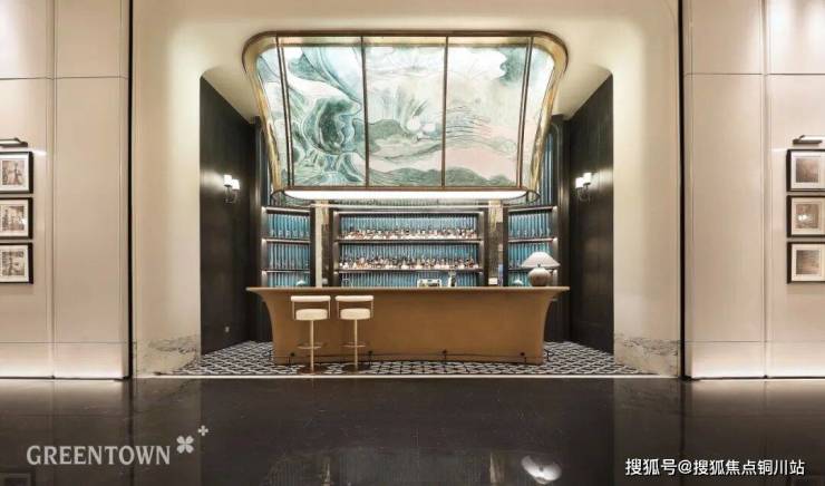 【香叙云厅】生活馆同样采用海派风格,大片高透玻璃幕墙,形成与中心花园的“无界”渗透。吧台上方硖石灯彩珐琅吊灯、墙面《灯影潮韵》主题艺术挂画,展现了海宁独有的文化记忆与地域魅力。