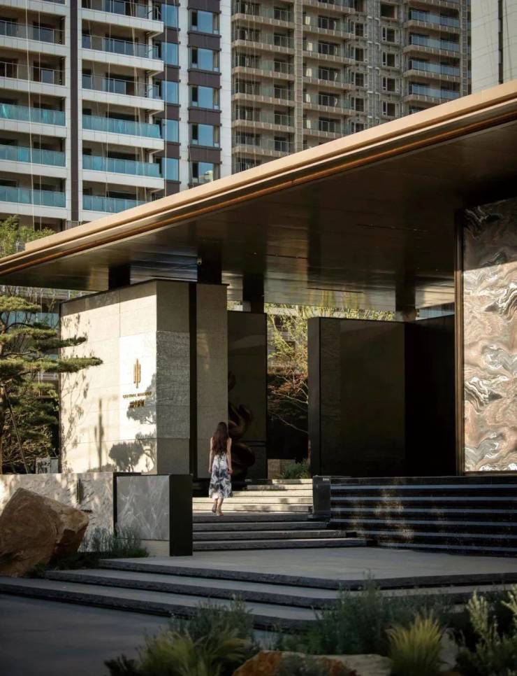 一座超大尺度的归家大门,长约66米,高近7米,整个地势抬高两米,搭配叠瀑水景,整个建筑仿佛立于水景之上,归家仪式感满满。面向街道、面向城市打开,主动升级城市空间,延展城市界面,将社区与城市互相渗透。