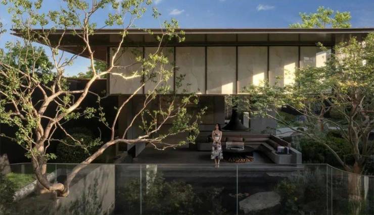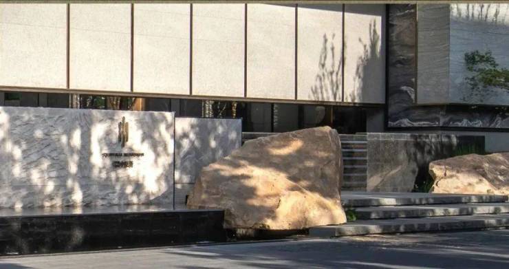 大门处有三块来自西柏坡的置石,合计200吨。水景石材是跨越了半个地球的安哥拉黑花岗岩。水景之上,约1.8米高的景墙是葡萄牙黄花岗岩。地面是豪宅经常用的滨州青石材。