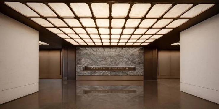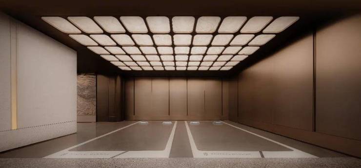 地下车库的车位高度约5.4米,顶部是“X”造型的穹顶,地面铺满了奢石,旁边为石柱,车库的墙面是金属漆面的背板,一整个顶奢配置。