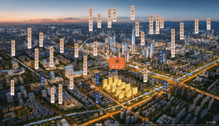项目雄踞老江东与东部新城交汇的“黄金十字轴心”,两纵两横干道环抱;双水交汇,静流低语,印证“宁波人的理想生活,永远离不开水”的世代情怀。