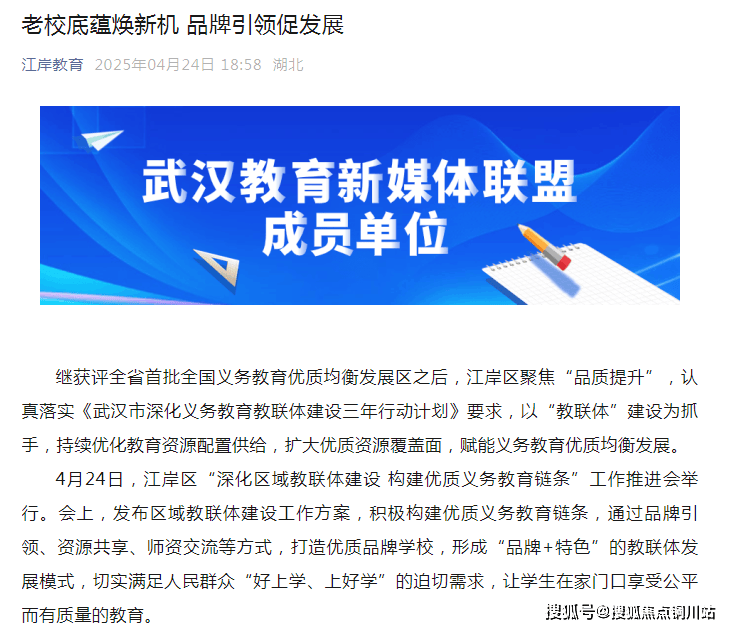 2025年4月24日,江岸区“深化区域教联体建设 构建优质义务教育链条”工作推进会举行,宣布将江岸区新村小学纳入“武汉市长春品牌教联体”,加挂“江岸区长春街第二小学新村校区”校牌。
