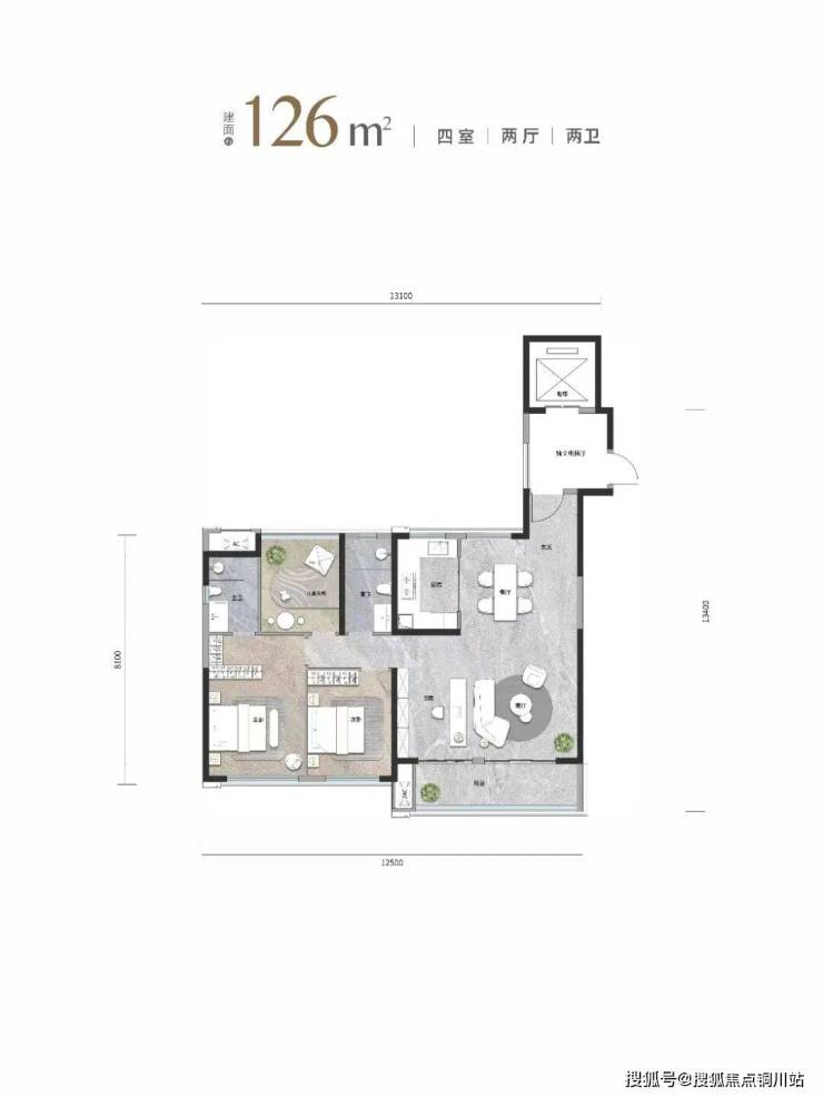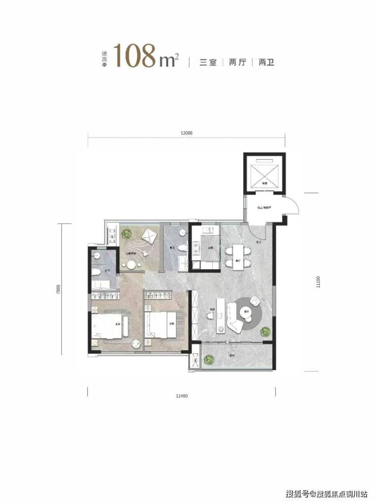 该户型分布于6号楼的边套,也带有独立电梯前室,南北通透,空间结构与上面108平的类似,不过户型结构更方正,室内功能区的空间更大。