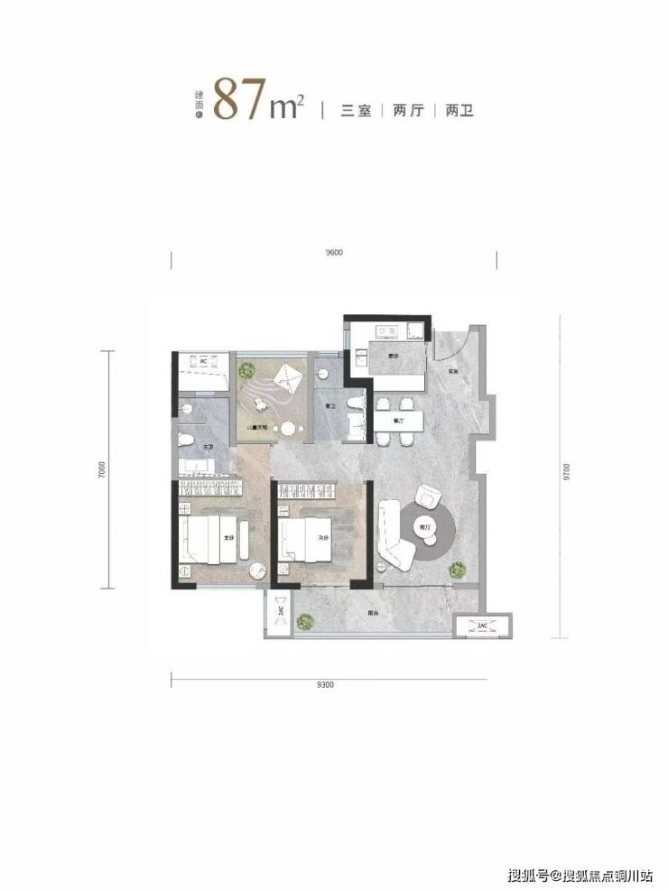该户型分布于5号楼的中间户,是常规的连廊中间套户型,不过功能性较强,这样的面积段能做成三房两卫,还是比较出彩的。