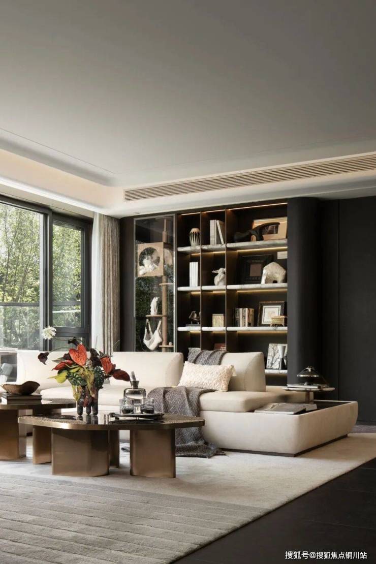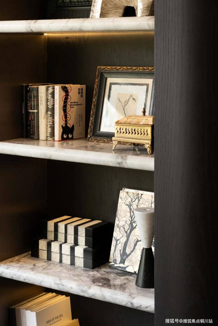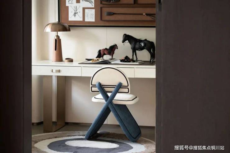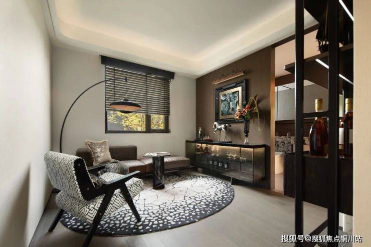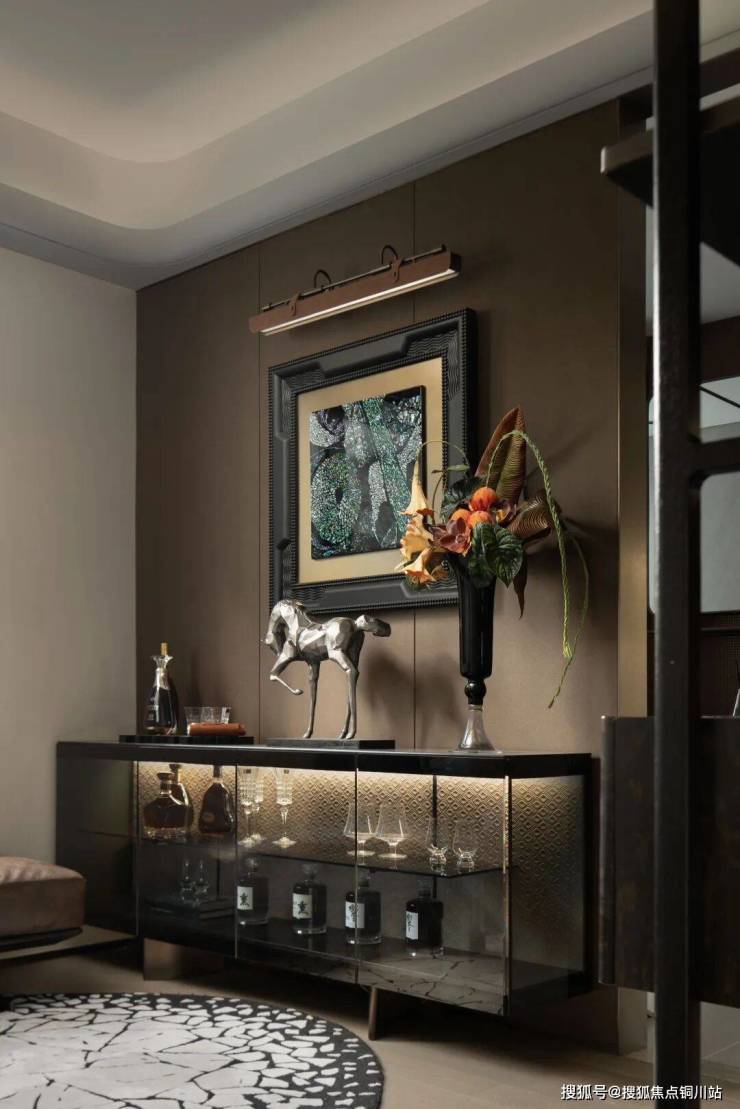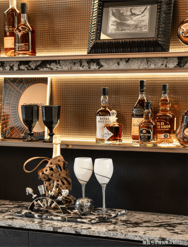 书房内皮质沙发以环抱之姿落定,弧形落地灯投下柔光穹顶,共同构建雅奢质感。通体玻璃酒柜如透明展廊,顶部骏马雕塑昂首,为空间烙下不羁精神徽章。酒柜的冷冽、皮质的醇厚、铜质摆件的光影重量,吞云吐雾间沉淀思绪,觥筹交错中品味人生,悉数融于生活惬意中。