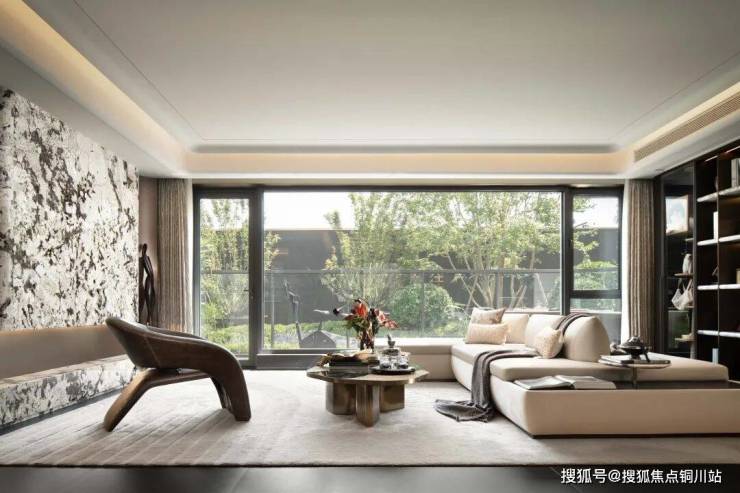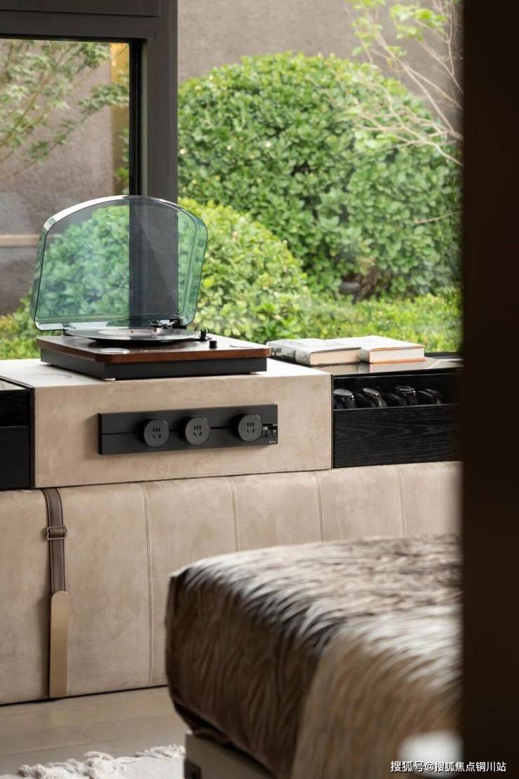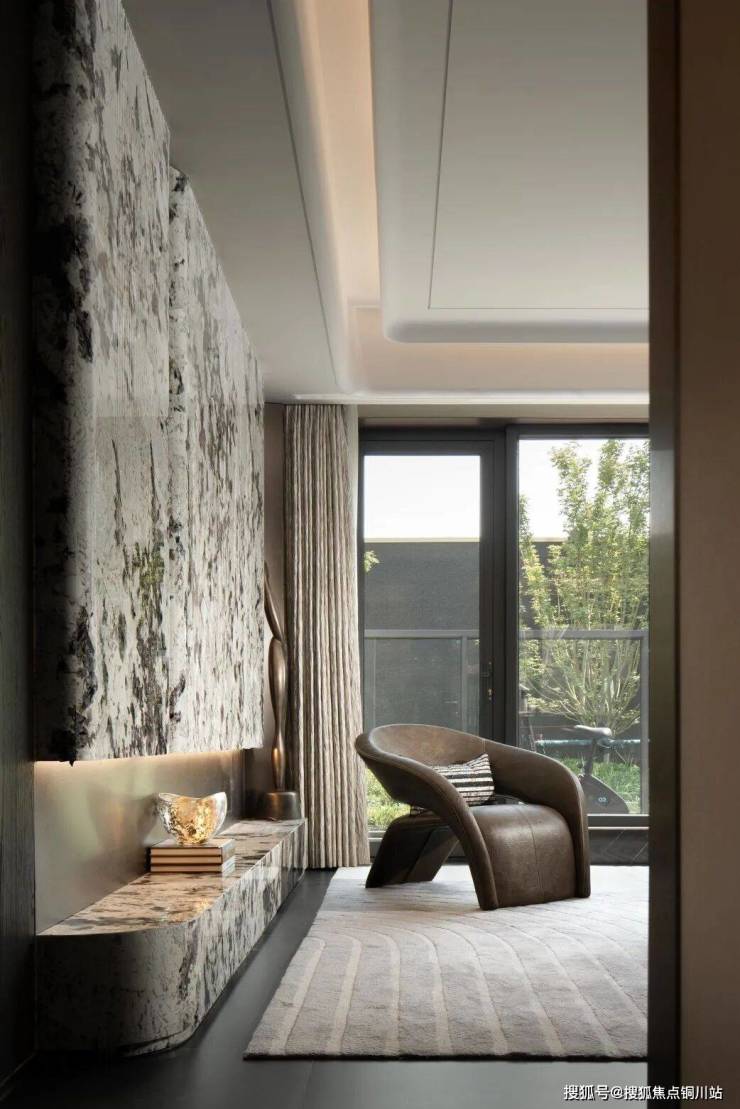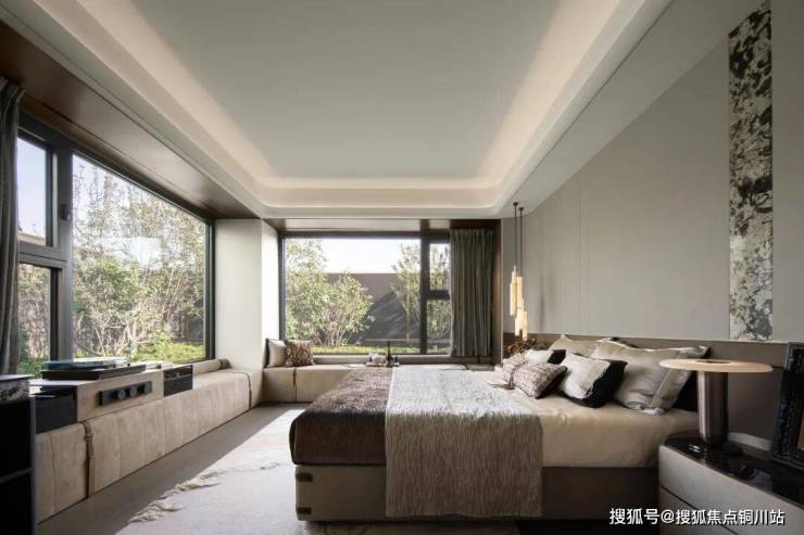步入主卧,低饱和的柔软包裹出休憩场所,L型飘窗作为功能性的景观焦点化身立体画框,大面积窗户作为自然光影的载体,日间绿意延伸空间维度,夜间转变为慵懒格调的阅读角落,实现“晨间凭栏望云,入夜蜷坐读诗”,既是放松身心的理想场所,也是连接自然与自我内心的诗意空间。