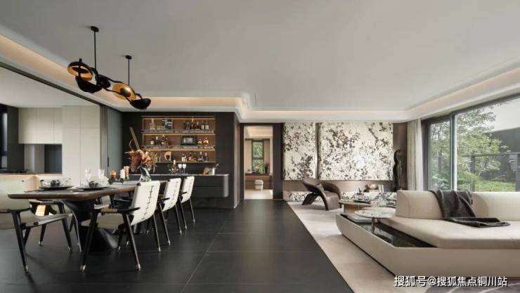 生活的烟火和诗意在餐域被诠释,一体成型的餐吧结构既满足日常用餐的温馨场合,又能在光影低垂时化成为私密吧台,客餐厨流畅通透,让流动的空气与光影在空间中自由写意,无主灯设计下,餐厅三盏线型吊灯精准垂落,强化用餐仪式感的同时,划分虚拟分区,高效交互各司其职。