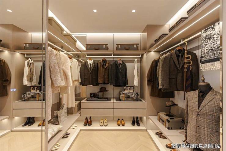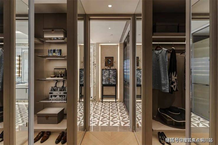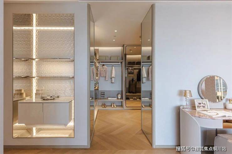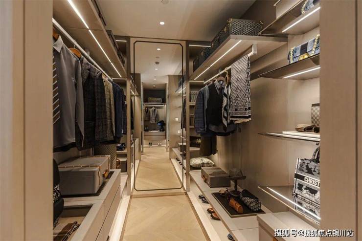 衣帽间从布局规划到色彩、材质、细节设计,峯层气质与卓然品味尽致呈现。开放式布局,搭配上灯光与镜子的点缀,带来最大化的敞阔与明快。合理的分区与规划,让一切物品归置有序,营造奢华精致的高级生活体验。