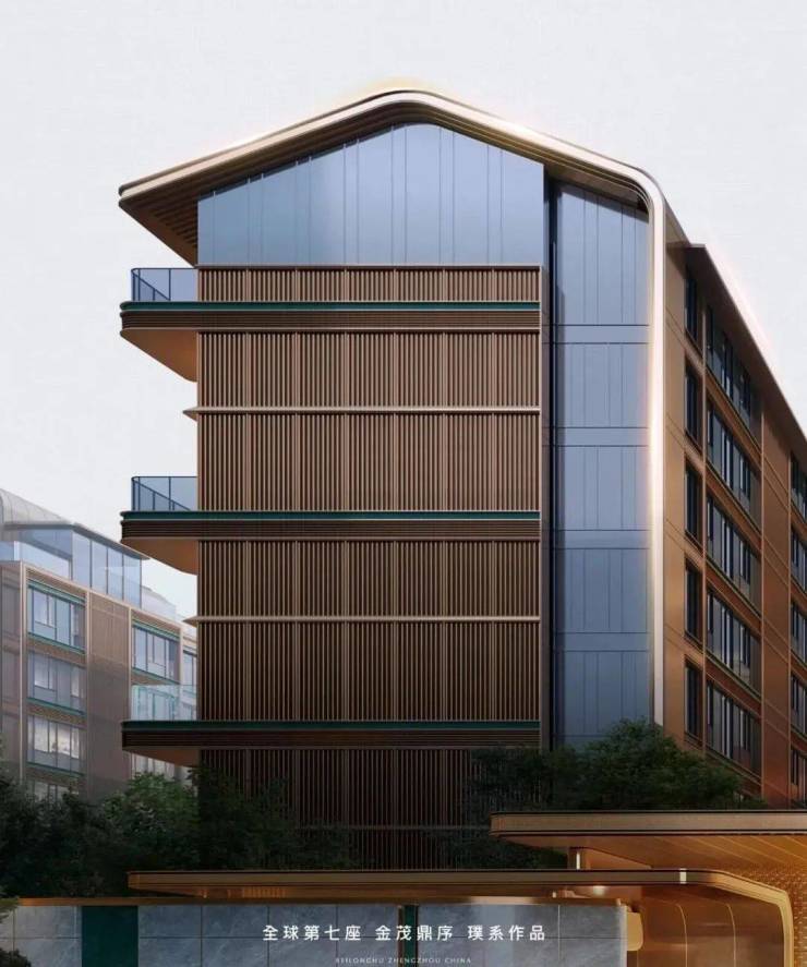 帝王以金昭礼序,以璞彰权柄; 建筑取青铜古韵,琢玉显尊贵。金茂璞逸云湖以「金镶玉带」的立面叙事串联中原文明千年脉络,建筑立面取色青铜鼎的斑驳古金,露台玻璃下方镶嵌绿石玉带,重现东方文明中“金玉相生”的珍贵意象。