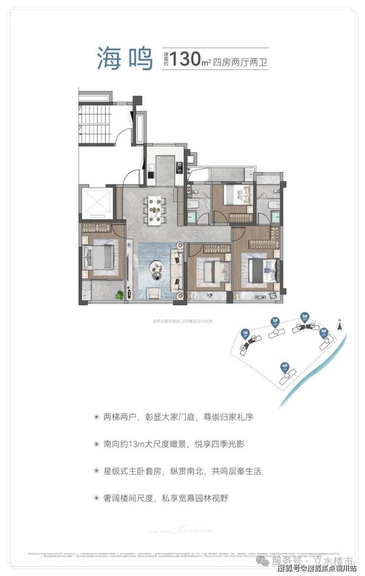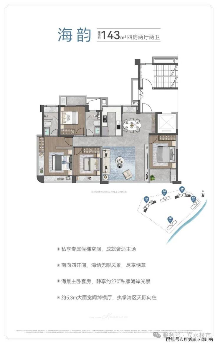 遵循现代典雅的对称式美学,大线条建筑构型,两梯两户奢宅规制,纯粹板式设计,造就超大窗墙比,南向超20m极致瞰景(建面约190户型产品),映照湾芯峯景入窗。