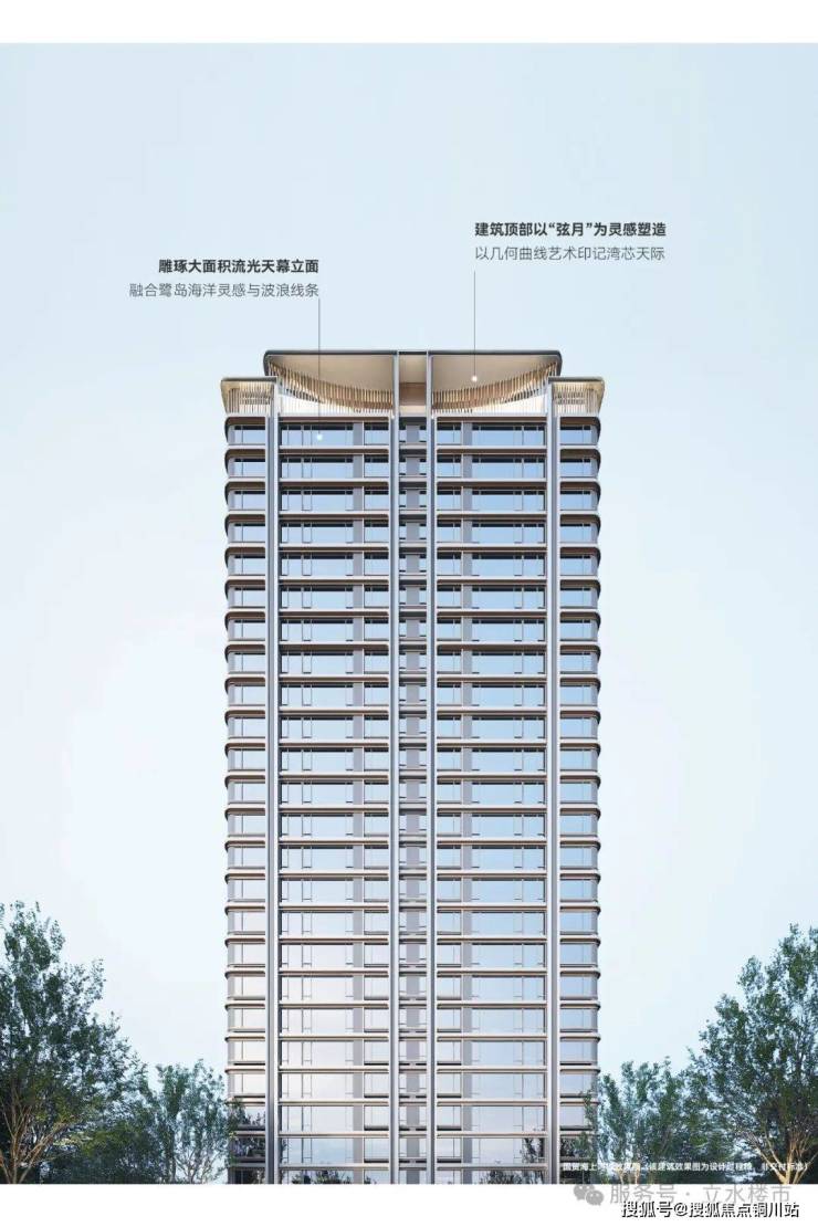 精研时代立面,恢弘天际美学,融合鹭岛海洋色彩灵感与波浪线条,雕琢流线式大面积天际幕墙,建筑顶部以“弦月”为灵感塑造,以数学几何曲线艺术镌刻湾“芯”天际。