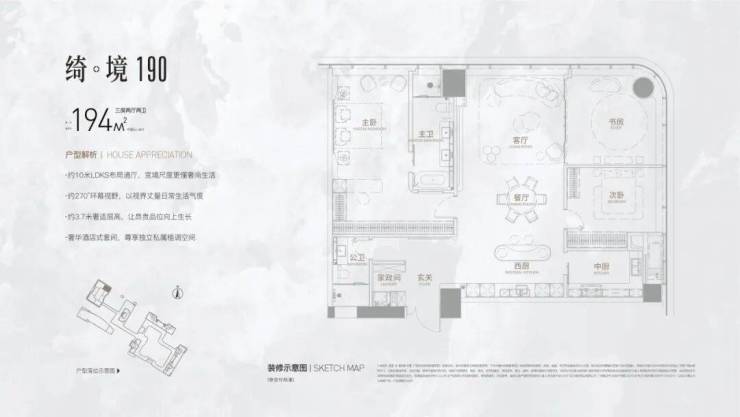 "绮境190“尊享户型,以约10米LDK通厅彰显奢阔空间,270°环幕视野拥抱自然美景,奢华酒店式套间营造独立私属格调,约3.7米层高提升空间质感,完美融合尊贵、舒适与品味,定义高端居住新典范。
