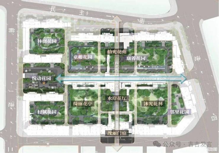 小区整体空间布局上采用:南北中心景观轴,东西邻里中心休闲轴,两道主要景观轴线,依托围合式住宅格局,充分利用超大尺度景观空间,打造「一庭两轴十花园」的主题园林景观。