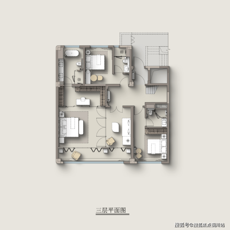 三层的超大主卧套房纵横捭阖,双开门入户、独立客厅、独立衣帽间、独立卫浴间等奢享配置一个不少,南向院子布局其中,内部可形成一个独立的洄游动线,在空间的一次次细分中,满足客户对梦幻主卧的一切想象。