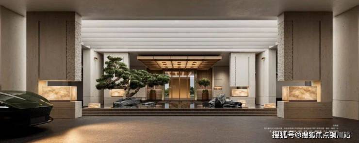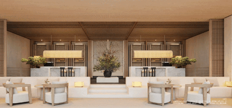 地上大堂在形体上采用中心对称式构图, 强调仪式感,两侧采用内凹环抱弧形墙面,玻璃、石材与格栅的搭配,给人以温润如玉的心理感受。