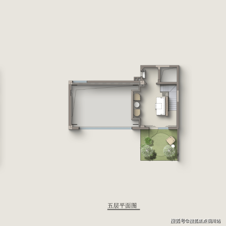 最后是五层还有一处独立的休息空间,室内预留的电梯井道可直达,外面连通着屋顶露台。可以在此打造一个独属自己、不被打扰的「私人基地」,看书、收藏、喝茶、观星……