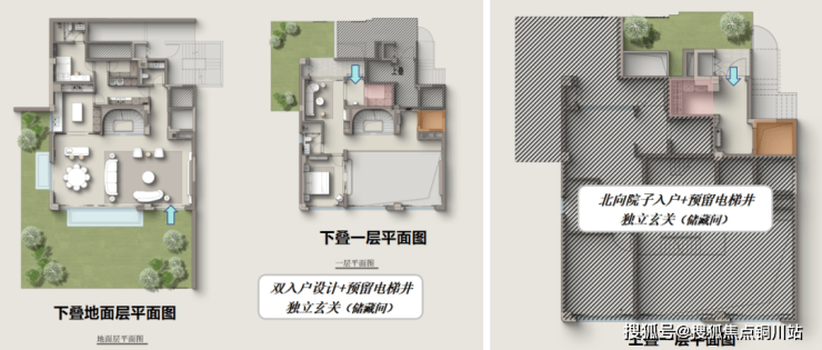 上下叠都可实现独立入户,下叠是南北双花园入户,上叠则从北向院子归家,尽量减轻归家动线的相互干扰,各有各的私享感。
