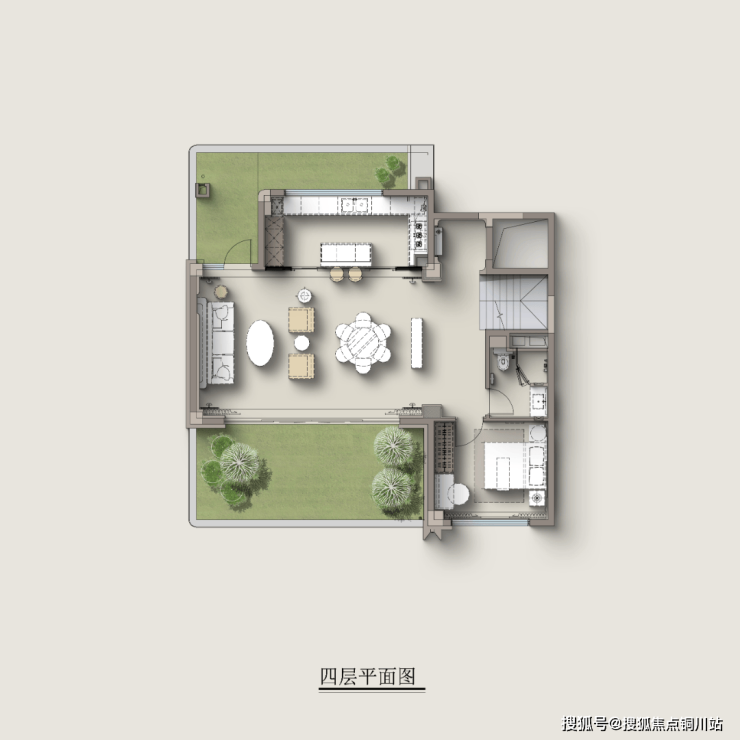 四层的超大客餐厅,无柱设计,双层挑空,空间尺度感瞬间拉满,给人一种误入大平层的错觉。且与南北双露台相接形成深度联动的关系场,让室内空间享受其带来的浓荫与明澈。