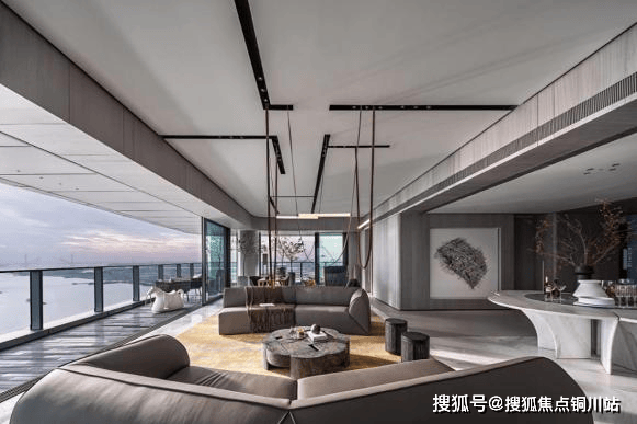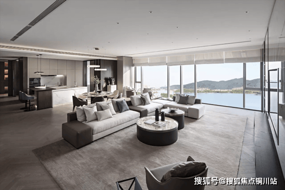 国际超前社交户型设计,双洄游动线设计、互动式轻吧台,赋予约100㎡江上会客空间,更为自由的多场景社交属性。柱化设计取消了客厅与阳台的视线之隔,增添空间的灵动感,将两江璀璨化作生活的背景。