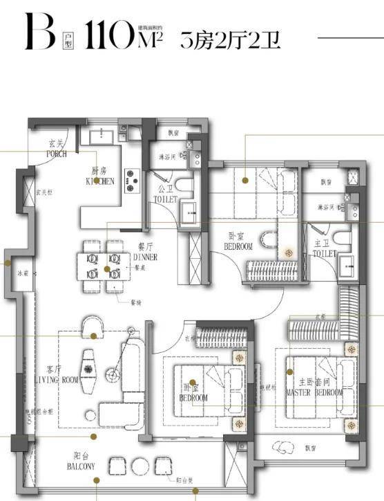 110平3房2厅2卫,在89平的基础上升级了主卫,主卫带淋浴间,以及同样有S墙、双阳台、X空间等设计,居住舒适度将进一步提升。