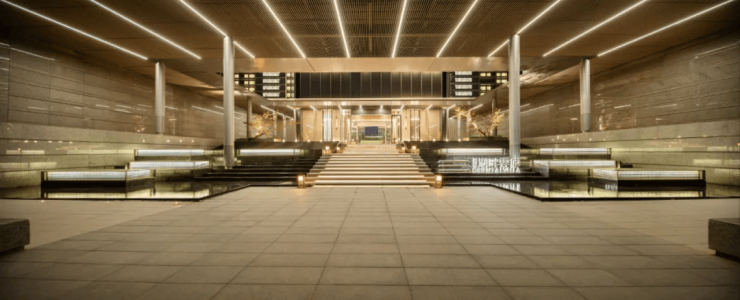 大面积的玻璃幕墙,搭配银色铝板,一圈圈勾勒出建筑的线条,金属灰点缀其中,建筑一体两面、各有千秋