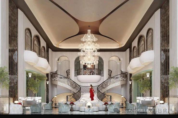 复刻厦门标杆项目建发・宸启瑞湖的海派美学基因:花瓣式艺术吊灯如飘落花雨点缀空间,南洋菱形釉彩地砖映出光影流转,Art Deco 线条与珐琅彩玻璃交相辉映,螺旋楼梯如当代雕塑般盘旋而上 —— 每一处细节,都是对卓越品位的精准表达。