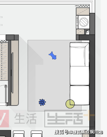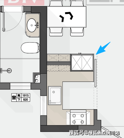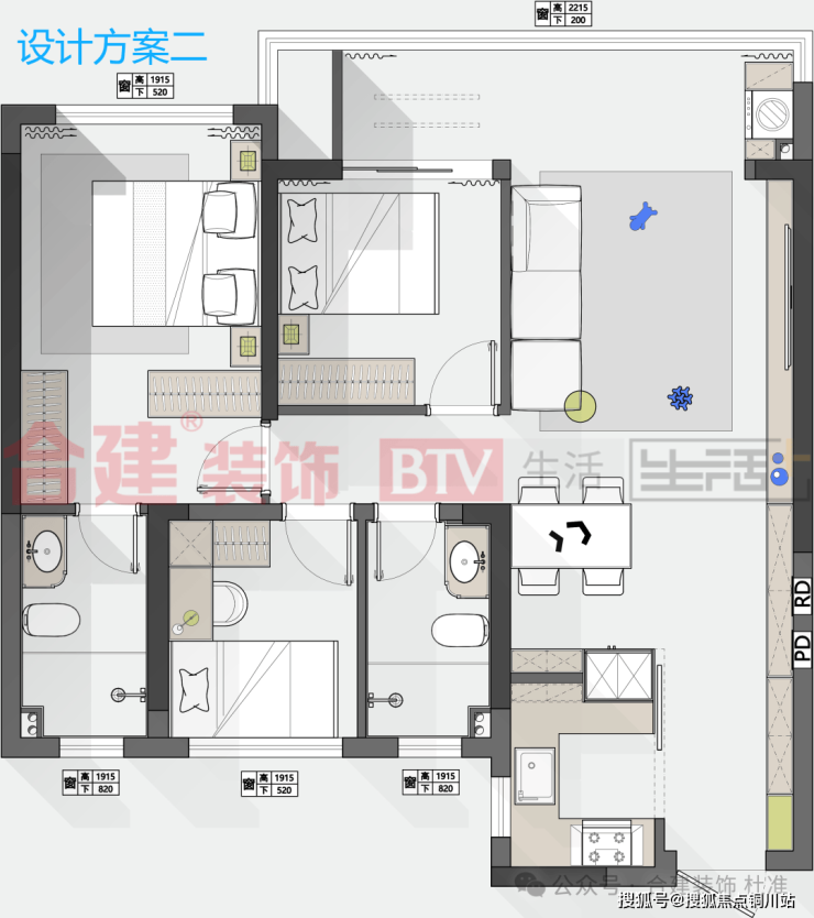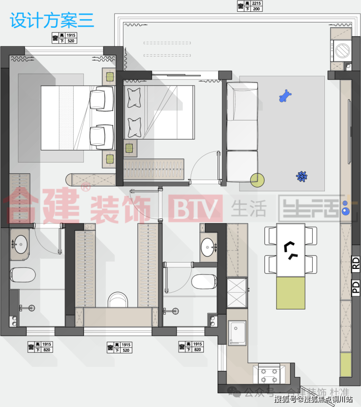 第三稿方案是两居室的设计,整个客餐厅做的也是纯开放式的洄游动线,冰箱依旧做内嵌式的两侧见光板跟橱柜与餐边柜衔接跟好看些,因做了开放式,台面偏少一点,所以平冰箱的厚度尺寸,做了个60公分深的餐边柜,台面可放置常用的小家电,喜欢喝咖啡,习惯用直饮机的业主也可以在这组台面上操作。