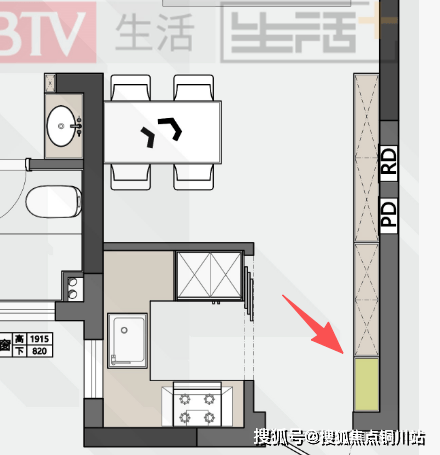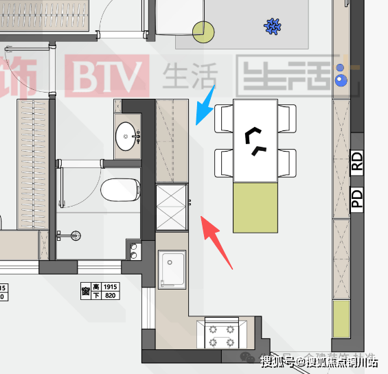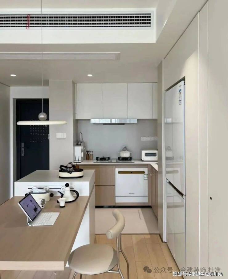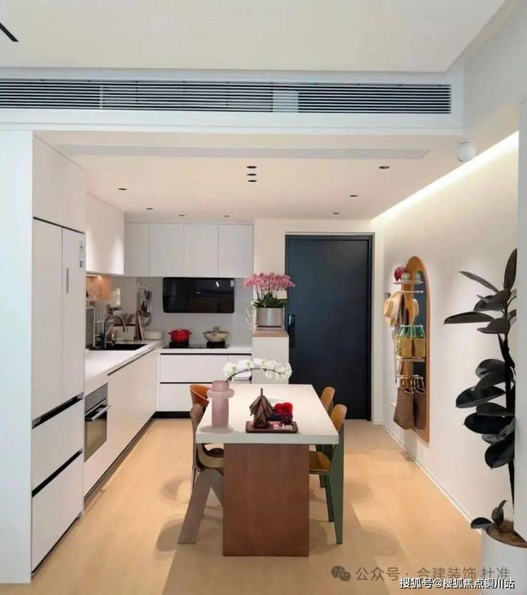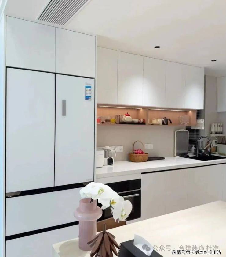 这高方案冰箱以内嵌的形式在厨房和餐厅中间区域,冰箱正对餐厅区域,对于厨房使用拿菜、备菜,以及客餐厅哪个水果、冷饮,这个区域都比较合适。冰箱三侧用见光板包住,冰箱背后,厨房区域可以再延伸出一组吊地柜的使用台面及储物空间,冰箱旁边还可再做一组柜子当零食柜或储物柜,离餐桌也更近,方便拿放。