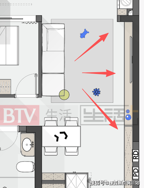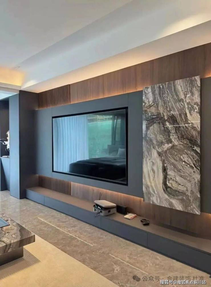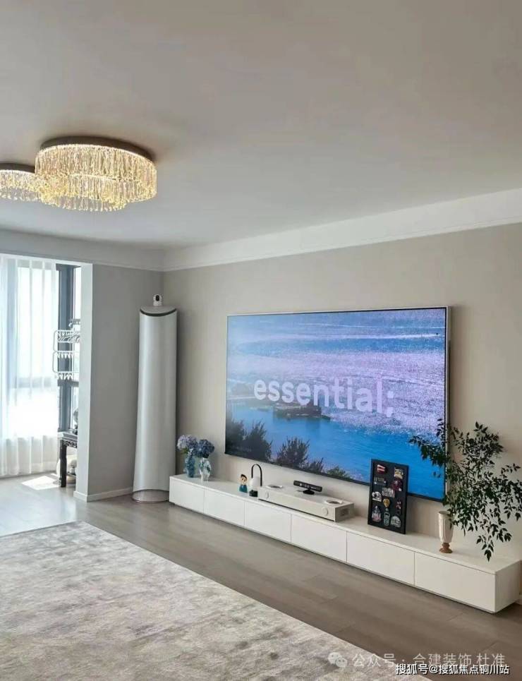 这稿方案我是把电视背景墙放在了次卧室这一侧,电视柜可以考虑定制悬挑形式或者地台形式,也可以考虑买成品的电视柜,也比较有质感一些,想简单装的业主,电视可以直接挂墙,喜欢稍微复杂一点造型的可以做内嵌电视背景,深度可以跟电视的厚度+背后支架厚度做平,显得轻薄些
