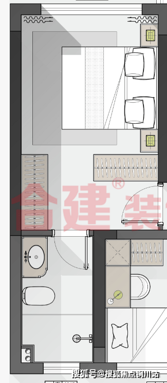 主卧区域把床头调转了方向,改变了常规布局方式,整体动线是先进入步入式的衣帽间,左手边进入主卧卫生间,右手边进入休息区域,既解决卫生间门口通风采光问题,又解决了卫生间门正对床腰的问题。