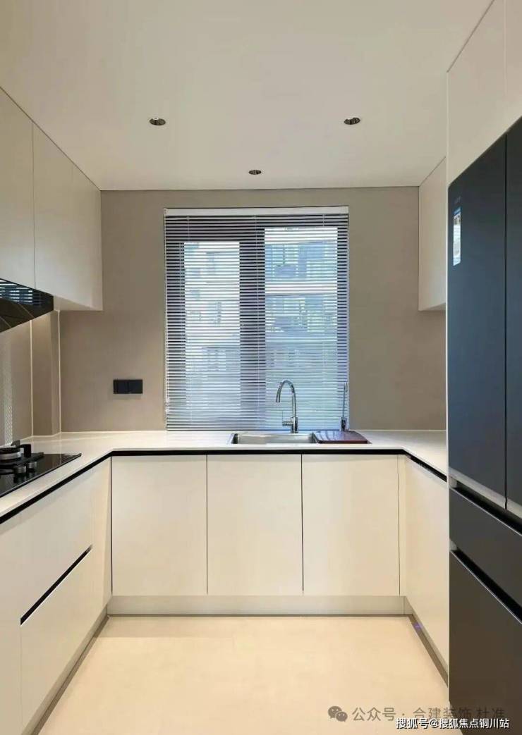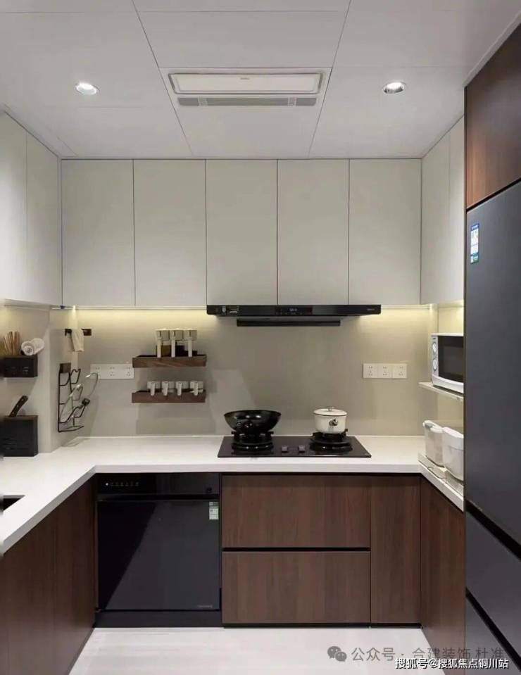 厨房区域是正常的冰箱放在厨房里侧,一组U型的台面,吊柜地柜结合