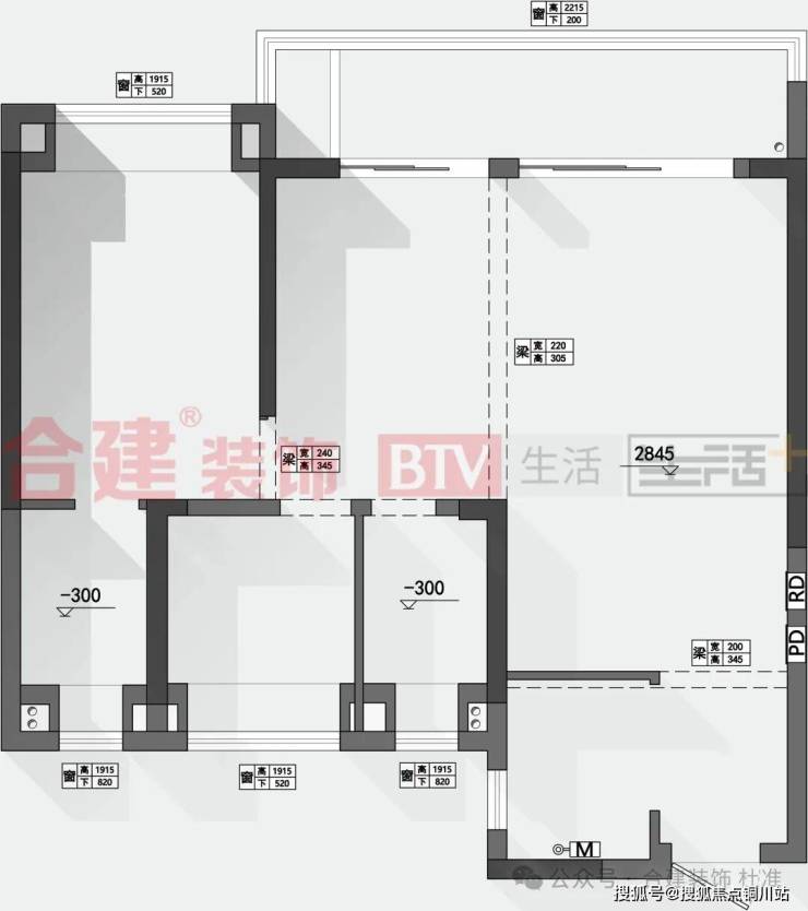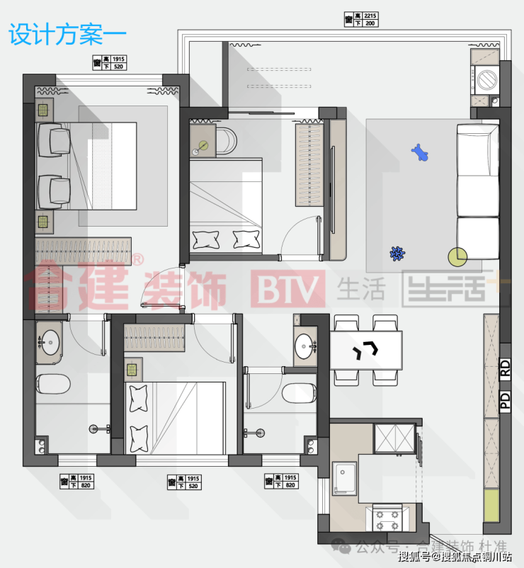 黑色部分为承重结构,灰色为轻体墙结构,虚线是梁体结构。99平米户型是武汉近几年新交房小区非常经典的户型结构,标准的三房两厅两卫一厨。我这边准备了三套方案,两套偏刚需型业主做的纯三房设计,一套偏改善型或一人居住的业主,三房改两房设计。承重墙以及梁体部分在图纸上表现的比较明确,所以偏三房的方案还是以常规布局为主,两房方案我建议以主卧套北次卧更舒适一些,当然把南次卧这个空间释放出来也没有问题,有这方面想法的业主我们可以私下里进一步沟通。