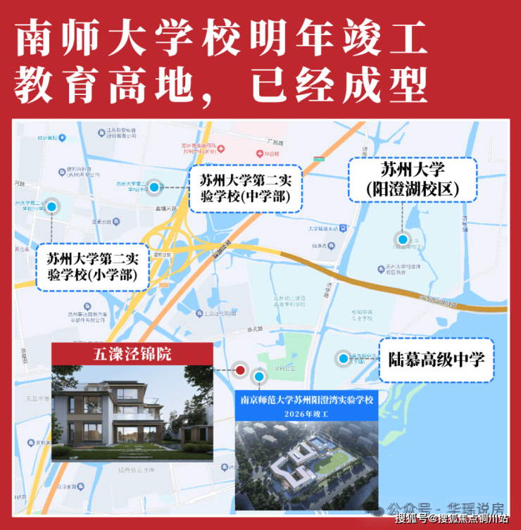 而小区东面真正一路之隔的9年一贯制学校——南师大苏州阳澄湾实验学校,南师大直属分校的含金量也不用多说,并且预计明年就将竣工,未来真正实现目送式教育~(信息来源:今日相城)