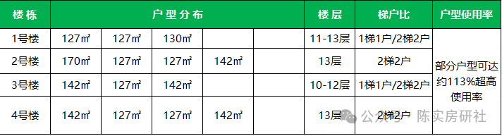 项目一共4栋住宅,均为两个单元的,且所有楼栋建筑高度均不超过40米。1号楼1单元为11F,2单元为13F;2号楼1单元为13F,2单元为13F;3号楼1单元为10F,2单元为12F;4号楼1单元为13F,2单元也是13F。项目的3、4号楼为西南朝向,1、2号楼为东南朝向。4栋楼均为2梯2户的设计。