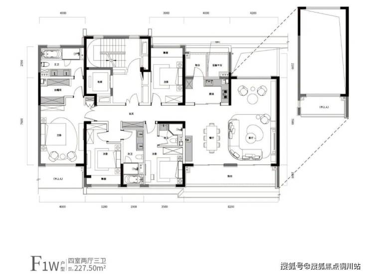 除此之外,两款王炸大面积户型更是吸睛无数!建面约227㎡的创新天空墅客厅挑高约6.3米,拥有堪比别墅的纵向空间,而建面约238㎡的最大户型则配置超17.6米的L型广角阳台,这般独一无二的阔尺感受,足以满足塔尖人群对豪宅产品的一切想象。