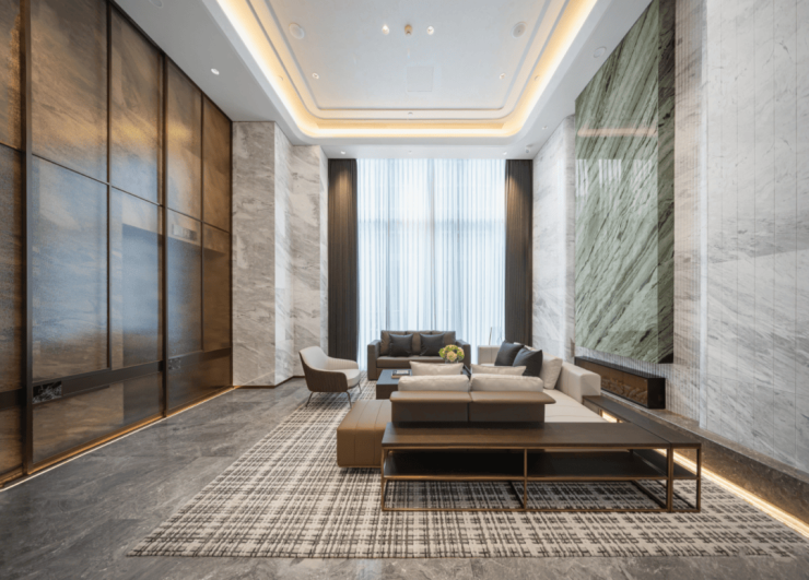 入户大堂墙面、地面都采用的是奢石铺设,再搭配落地窗前的休闲区以及墙面内嵌式景观点缀,格调十足。