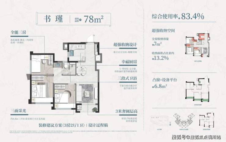 建发·书香云锦78㎡户型综合得房率高达83.4%,空间高效利用,打破了刚需对上车产品的刻板印象。不计产权面积约6.8㎡,相当于多送了一间小书房或储物间,妥妥的白捡的大便宜。而且该户型还做到户户边套,南北通透,卧室并非普通产品的采光井采光,而是正常的开窗面采光,真正做到刚需产品改善的品质。