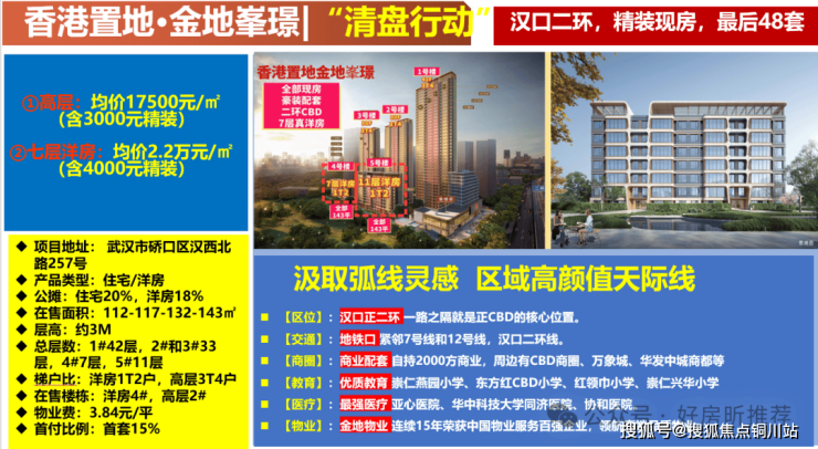 香港置地·金地·峯璟项目占地面积约2.21万方,总建筑面积约8.78万方,规划户数共计544户,容积率仅3.0,是武汉二环为数不多低容积率楼盘,也是武汉 CBD 板块难得的高品质社区。