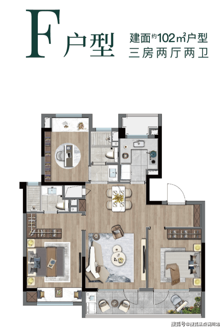 除了约138㎡王炸户型,樾湖尚郡建面约102㎡洋房户型,也是精雕细琢。