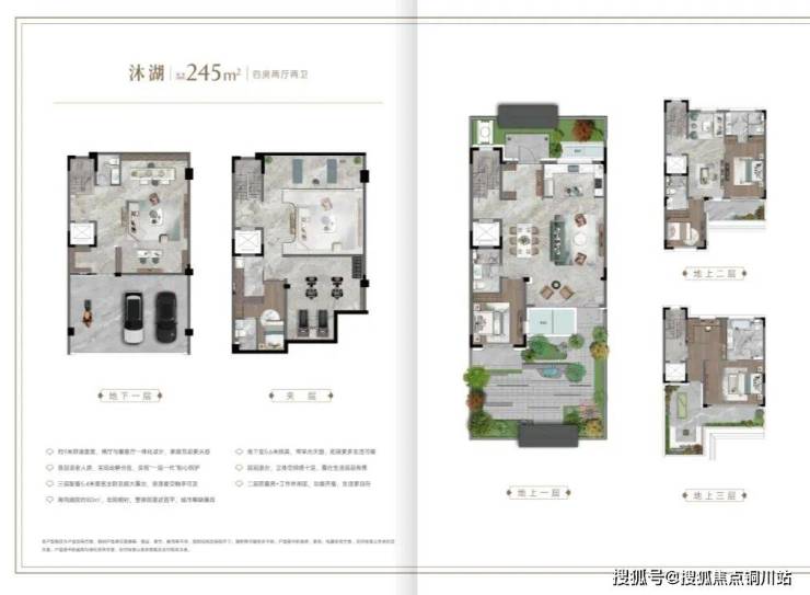 面积段为建面约245/287/295/365m²四大户型,依户型不同,巧设三面围院和南北分院两种格局,地面三层+地下两层的垂直动线,实现了完美的功能分区:
